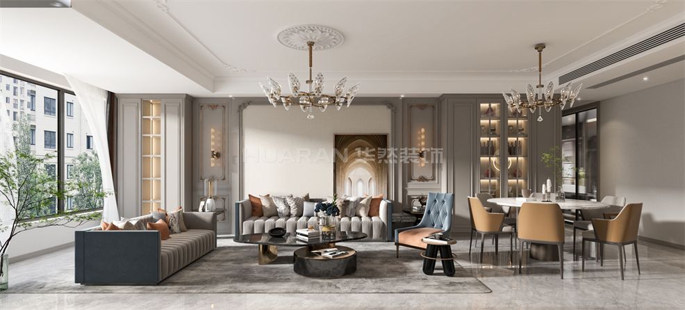 在整個空間用質樸的灰色調為視覺基礎,輔以深色的軟裝家具,低調而沉穩的空間氛圍呼之欲出,還帶著一種高級的質感。 耍客廳的沙發背景墻和電視背景墻利用石膏線條裝飾出畫框感,細膩的美式線條在空間里律動著,布局.上的對稱式設計,也更加規整有美感。